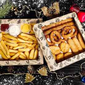 • Фирменный кулёк «Цезарь» (картофель по-бельгийски, наггетсы, соус на выбор (идеален классический Цезарь, кисло-сладкий)